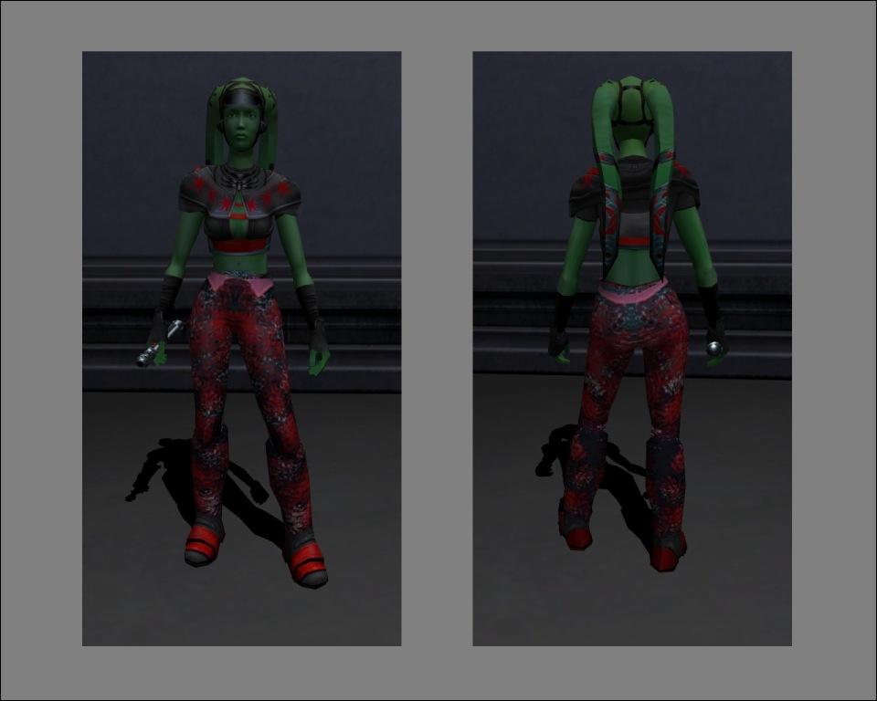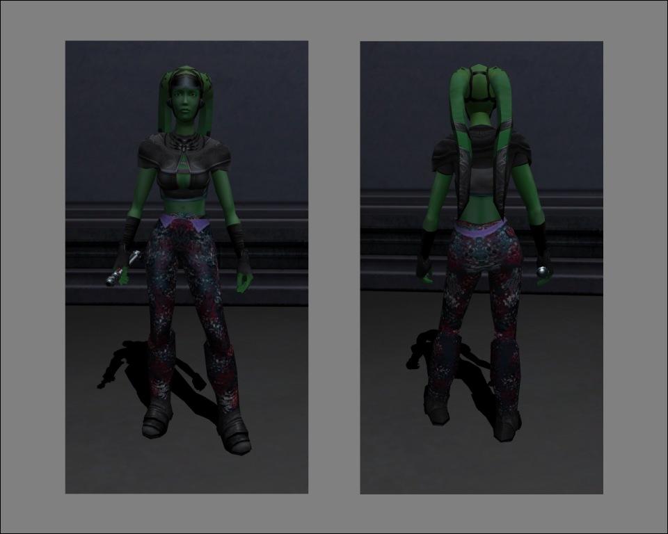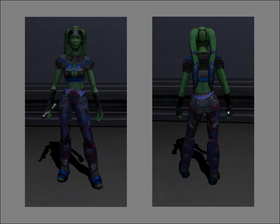 This is one skin that makes alora's skin green and her clothes more dark-side. It gives her pants a speckled red white and black look.