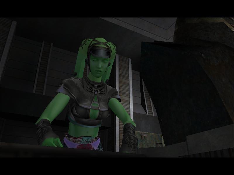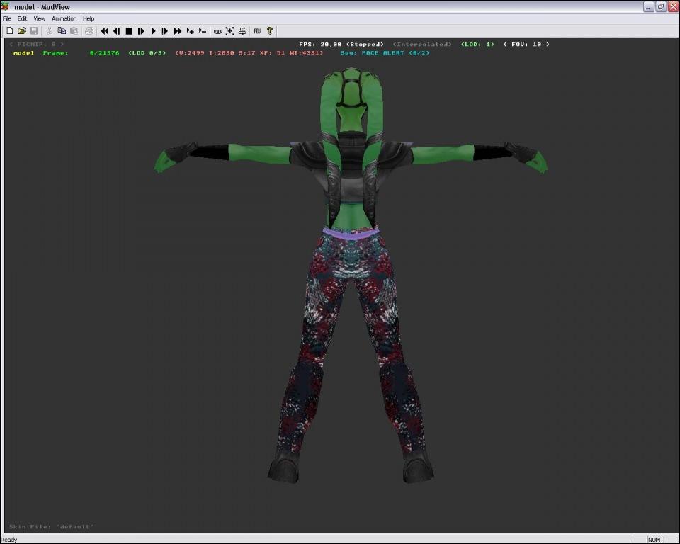 This is one skin that makes alora's skin green and her clothes more dark-side. It gives her pants a speckled red white and black look.
