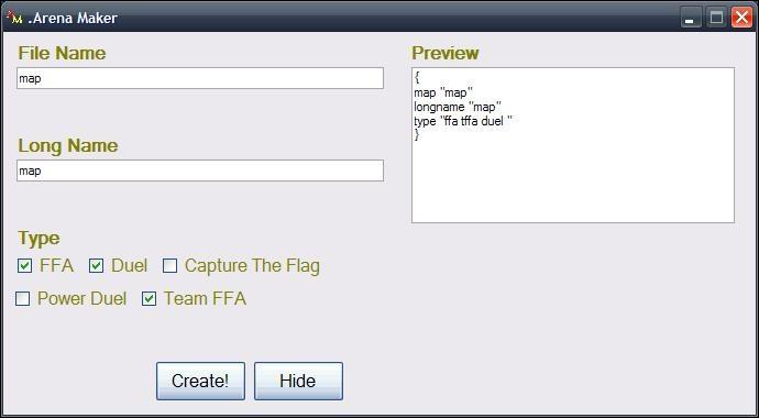 DESCRIPTION: This program makes it easier to make .arena files for your maps. It automatically generates a format for .exes and fills in your map information using textboxes for the map name and map title and checkboxes for game types. It automatically saves the file as a .arena with the name of your targeted .BSP file in the destination you choose.