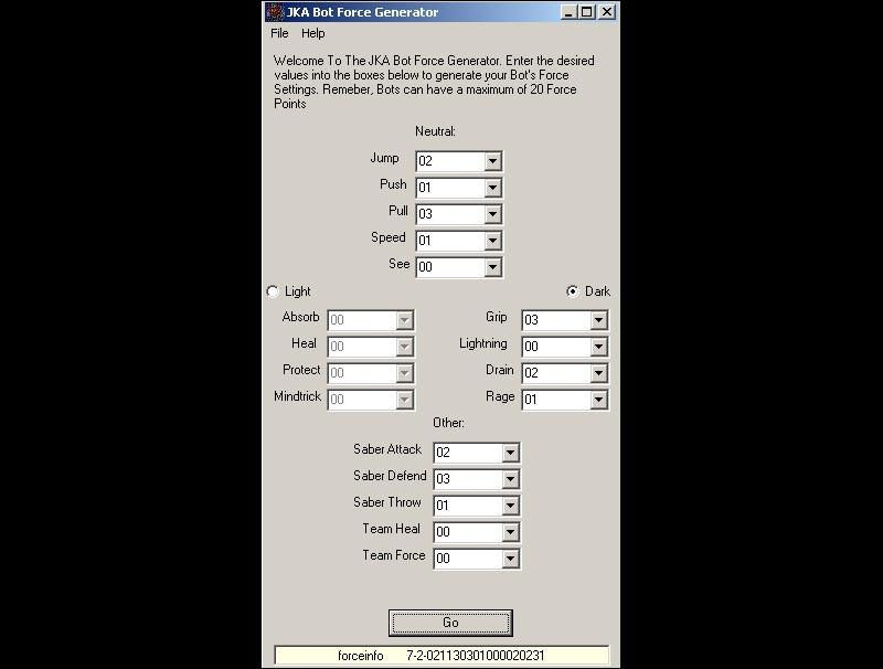 bot .jkb files in JKA. In the .jkb files, it asks you for force settings.
