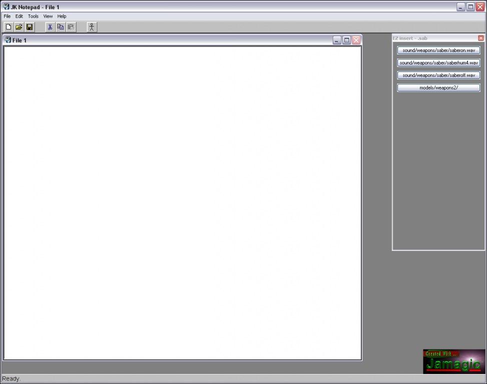 JKNotepad edits common text-format files found in JK2 and JKA. Though these files can be edited with a simple text-editor like "Notepad", I have found that some people cant or dont know how to work with these files. So I decided to make an editor for people in that kind of situation. Also this program has a few tools to help make editing and modding files a little better and maybe even funner.