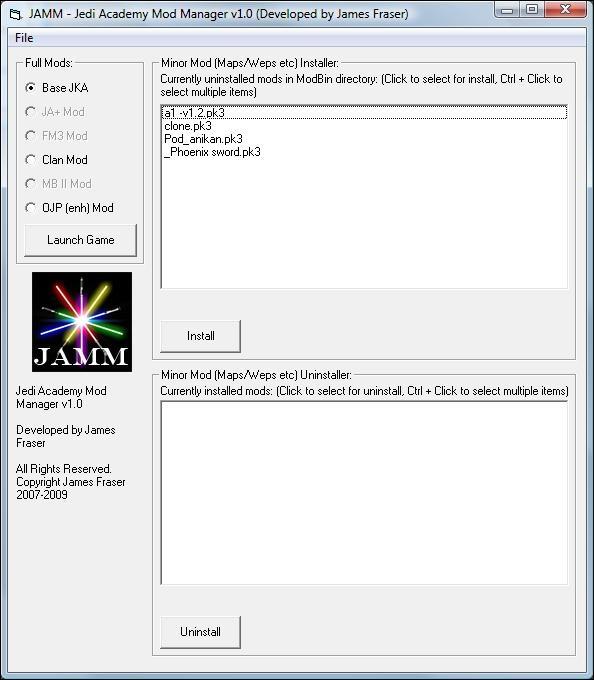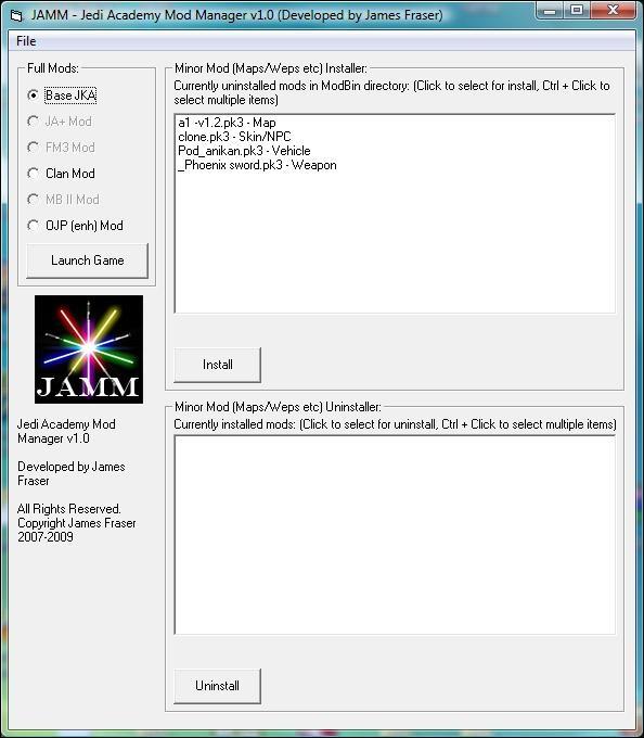JAMM is a Mod Manager for Jedi Academy, showing all currently installed mods in the mod folders (except japlus_gla_anims.pk3) and allows you to execute Jedi Academy with either ForceMod III, Jedi Academy Plus, ClanMod, MovieBattles II Mod, Open Jedi Project (enhanced)or No Game Mod activated automatically (saving you having to go to Setup>Mods after loading the game). It also has a .pk3 installer/uninstaller which is simple and easy to use, making it really easy for those of us who don't know how to install a .pk3 or those of us who just can't be bothered to load the base folder. Simply click the file you want to install/uninstall in the appropriate list and click the appropriate button. The program is still being developed (hence only v0.6) and I open to suggestion about features you would like to see in it. Email me any suggestions and I'll see what I can do.