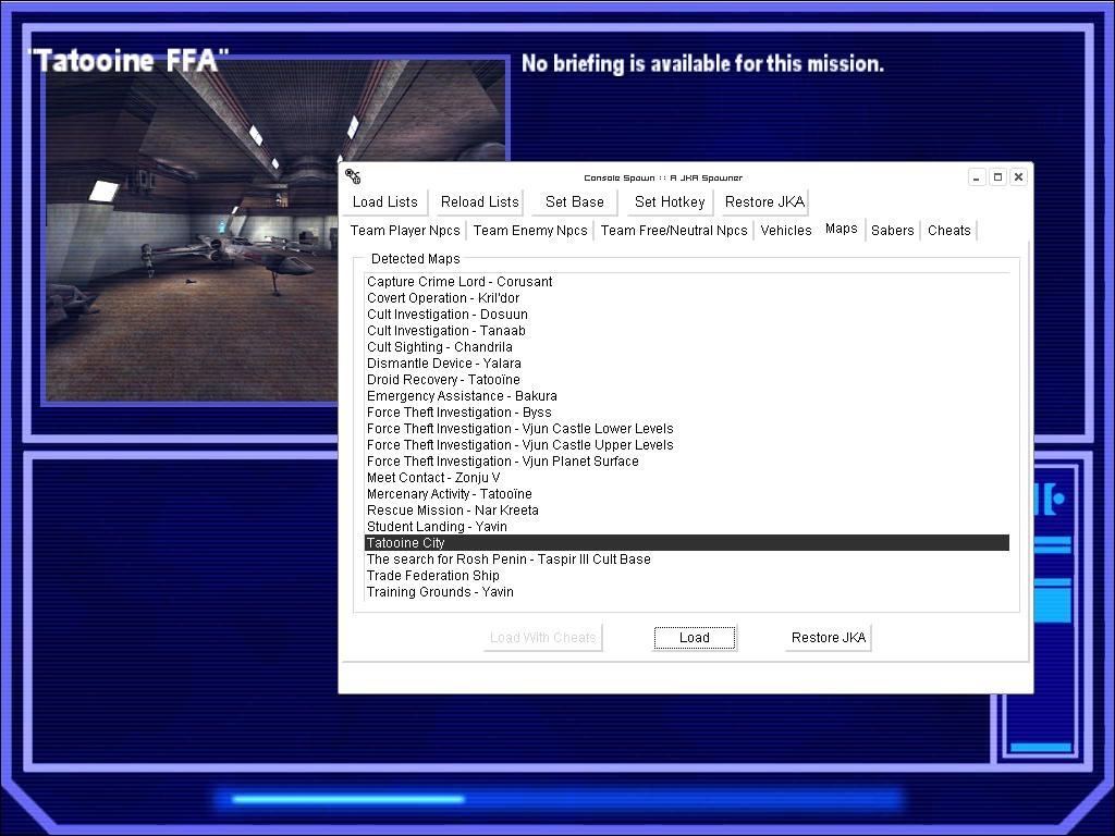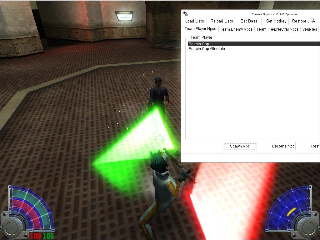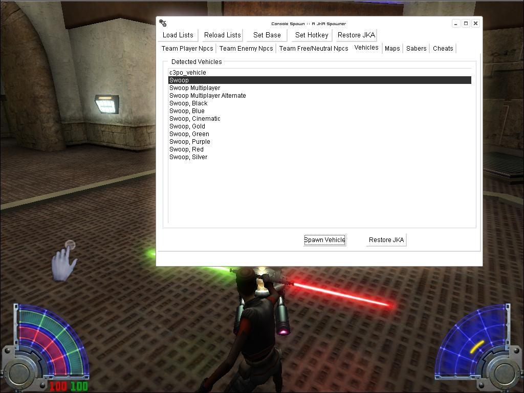 Console Spawn is a programme that allows you to spawn npcs/vehicles/sabers load maps and apply some cheats for a running version of JKA.