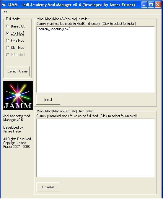 JAMM is a Mod Manager for Jedi Academy, showing all currently installed mods in the base folder (except japlus_gla_anims.pk3) and allows you to execute Jedi Academy with either ForceMod III, Jedi Academy Plus, ClanMod or No Game Mod activated automatically (saving you having to go to Setup>Mods after loading the game). It also has a .pk3 installer/uninstaller which is simple and easy to use, making it really easy for those of us who don't know how to install a .pk3 or those of us who just can't be bothered to load the base folder. Simply click the file you want to install/uninstall in the appropriate list and click the appropriate button. The program is still being developed (hence only v0.6) and I open to suggestion about features you would like to see in it. Email me any suggestions and I'll see what I can do.