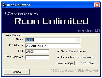 Rcon Unlimited is designed to be the next generation of remote control of Q3 powered servers. Most Servers admin have heard of (or used) Rcon Commander. This program is designed to be the replacement of Rcon Commander, giving you many more options and abilities.