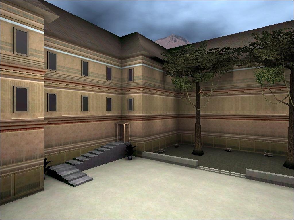 This is a small duel map. As you can read, it's a courtyard between three houses with doors, stairs and windows. There is also a garden with two high trees and some park benches.