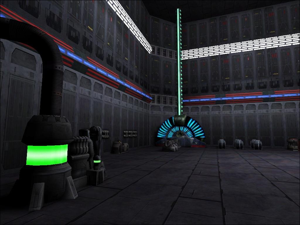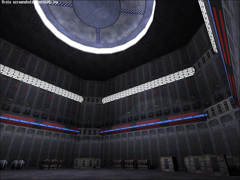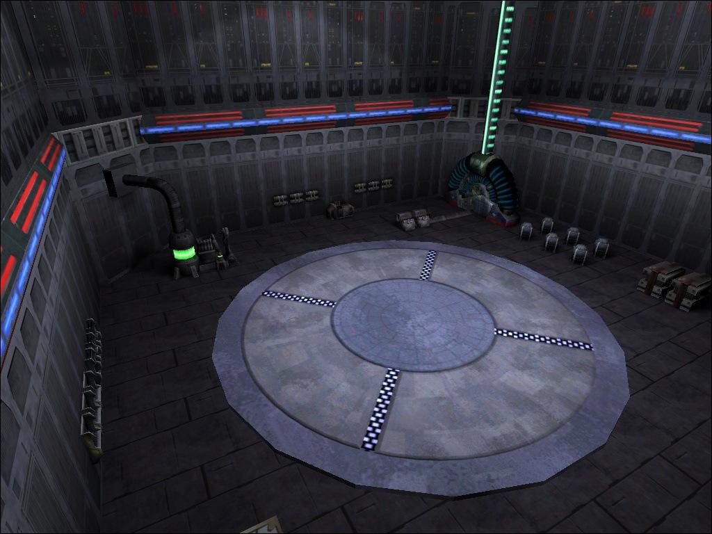 It's an enthralling duel map. The lower room, showed in the screenshot, is a real deposit of everything: a generator of power, a crystal machine, many boxes and crates and a console. The center circular is an elevator. It will slowly go up to the second room, giving the impression of a movie duel in difficult conditions. The upper room has got a very big lamp and many ATST's disposed in circle. The area around the ATST's is in the shadow.