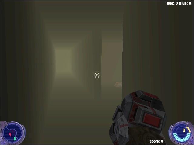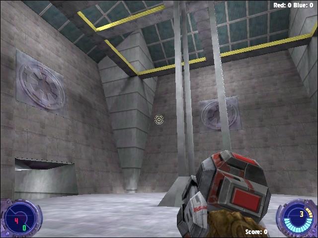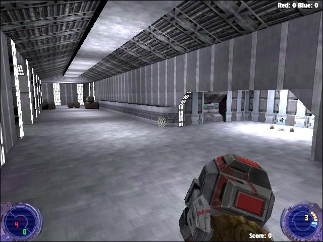 Map description :The map has one large main room with a large hall surrounding it, and a secret maze that has some objects in it. The main room has a vent in the center that blows you up to a system of catwalks, and four side pits that you can bounce in. The vent and the catwalks can make for a fun saber duel. The large hall has piles of crates on the side that can be used for hiding, or defense. Theres also two rooms built into the wall. One of the rooms has a blaster in it and the other has dozens of crates that can be used for hiding and ambushes. Bot support is included.