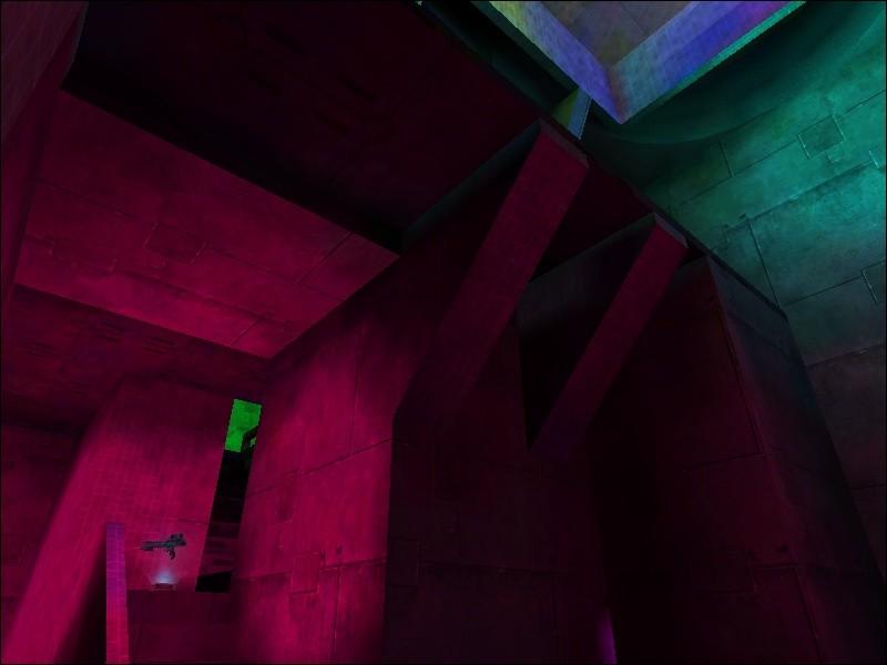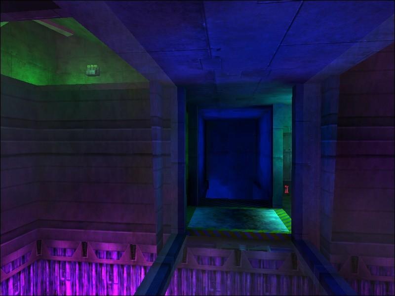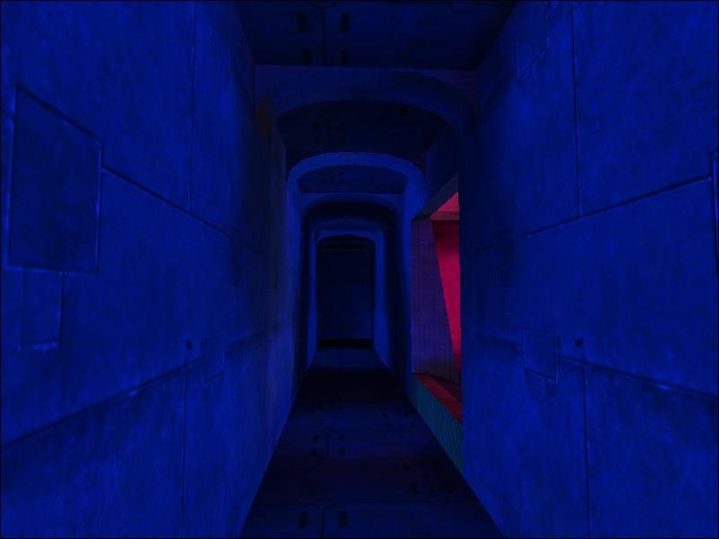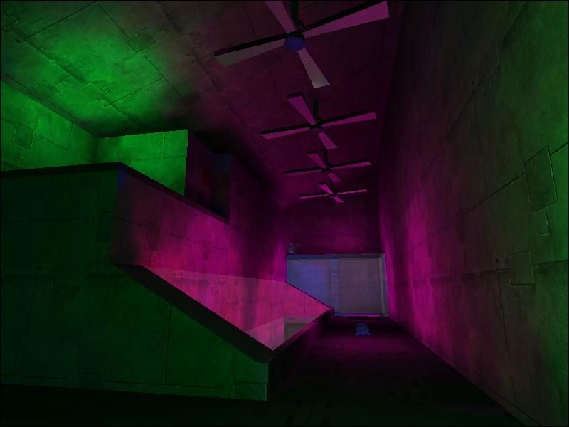 This map has multiple colored lights throughought it, but overall it is very dim. The idea is to give the map an eerie, spooky feel to it. It is not too big but, it has some cool things in it like elevators , rotating fan in the roof and a train that the player can ride with, and a moving crate to contend with, in the middle of the map.