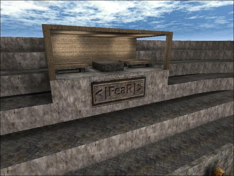 Description: This arena was created for my clan. It wasn't really anything that was planned though. One day, I was browsing some random forum somewhere. Someone suggested a mapper make a roman-collesium like map, with tunnels beneath it. And so, the <|FeaR|> Clan Arena was born. It consists of 1) an above ground collesium with a floating duel platform and VIP seating, 2) a second level with 3 duel rooms, and 3) a third level with a floating platform above a bottomless pit.