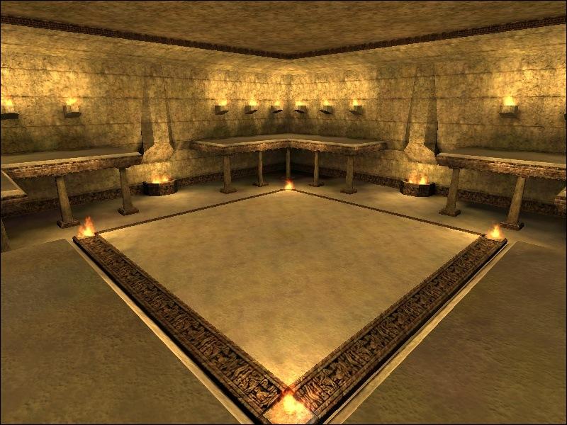 This map is set in a temple dug underground. All the light comes from the torches on the walls. The Reunion Room is upstairs and it's equipped with 12 seats. You can get to it passing through the Entrance. All the other rooms are downstairs. The Techniques Training / Duel Room is the first one is on the right after the first corridor. The Pillars Room is on the left. Go straight on to get to the Tournament Hall, with spectator seats on 2 sides and a large duel area in the middle.