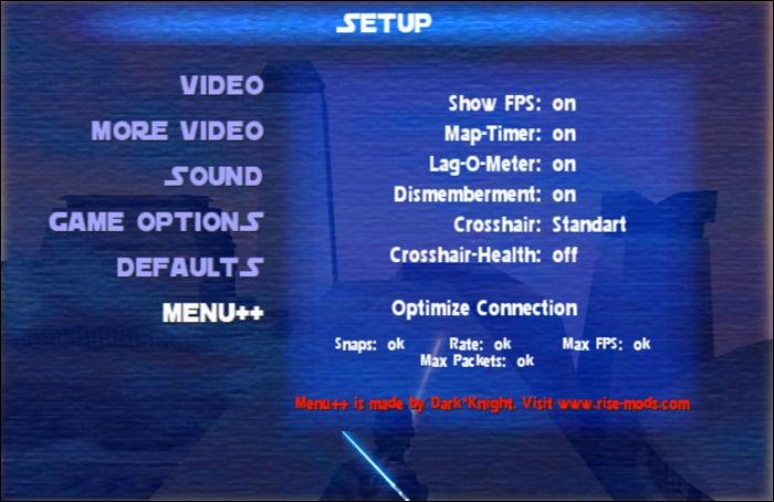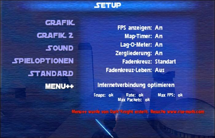 Menu++ adds a new Menu to the INGAME Setup. There you can change additional settings, which I find important (like show the FPS or the Map-Timer).