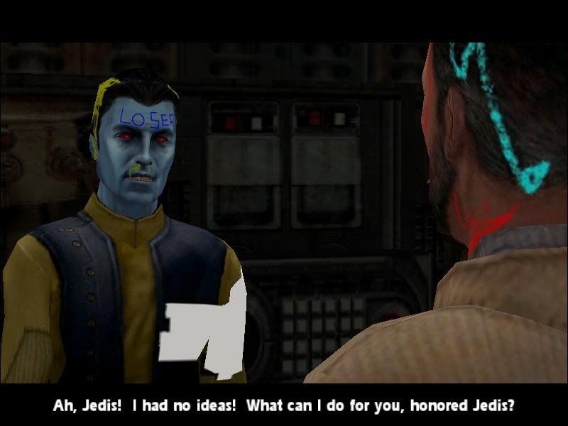 DESCRIPTION: This is a Mod that changes what kyle, the rodians, the weequays, the grans, and the bartender looks like to a more comical lol look! Also the voice overs are changed to be more comical as well. Remember! This is just a demo! In the Full-Length version EVERYONE will sound and look different!THIS MOD IS FOR SINGLE PLAYER!!!!! Okay it can be used for multiplayer if you so wish but it is mainly for singleplayer!