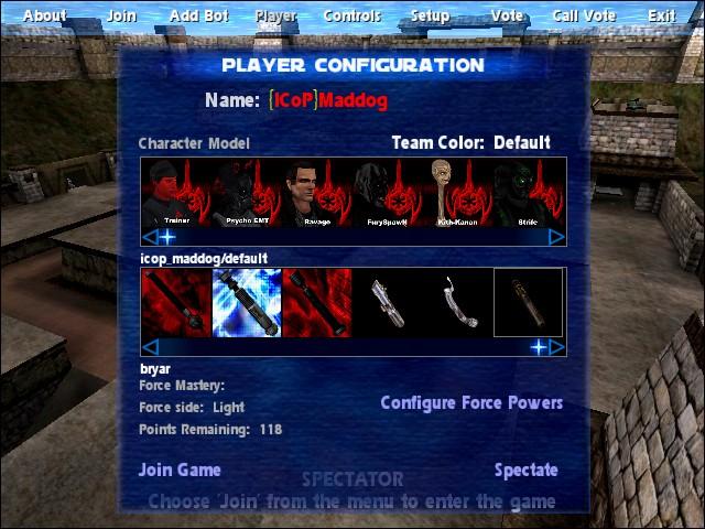 I've never liked the default lightsaber. In my opinion, it doesn't look like something Kyle Katarn would design. I'm a believer in lineage in lightsaber design; i.e., that the Obi-Wan Kenobi saber resembles the Qui-Gon Jinn saber for a reason. Given that, the Kyle Katarn saber should be influenced by the Qu Rahn saber, the Yun saber and the Luke Skywalker saber, if you assume Luke completed Kyle's training. The Katarn saber should also be a parent of the Mara Jade saber given that Kyle trained her in MotS. (I used the Parks version of Mara's saber for reference.) Well, after more designs than I could possibly number, I couldn't find a combination of those four that worked. After weeks of frustration, I realized I'd left out one more parent: Kyle's Bryar Pistol. I'm surprisingly pleased with the result. (I hate most of what I make.)