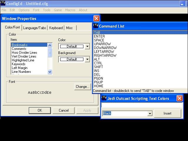 Added 'JK2 Scripting Colors' in the Font menu. It allows you to insert customized text with coding
