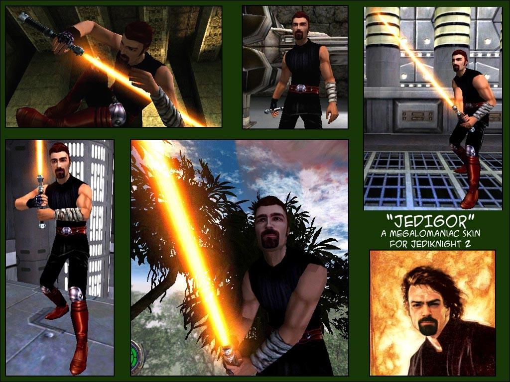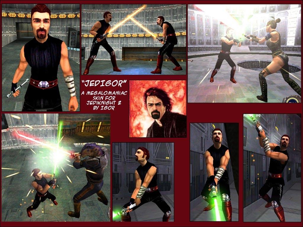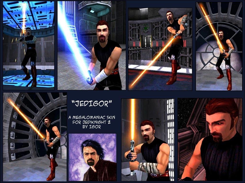 Just extract the jedigor_final.pk3 file to your base folder (jediknight2/gamedata/base) for MP game. For SP game ADD the jedigor_kyle_sp.pk3 (replaces kyle) or/and jedigor_Luke_sp.pk3 (replaces luke) into the same folder. I suggest you do know replace Kyle and Luke by Jedigor at the same time... Place the spawn.pk3 in your data base folder also and you will be able to spawn my two skins (see above)
