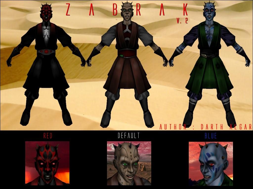 Updated the original Zabrak skin A LOT. I changed nearly everything, from boots to face. I tried putting hair on the head but it would never look right, so I left it bald. Each skin (default, red, blue) is quite different from each other, like they were from different sections of the galaxy. Each has different tattoo designs, eyes, clothes, skin color, etc. The default skin is a random Zabrak character I created named Zarik Diroan. He sorta looks like he could be a jedi or just a commoner. The blue skin is Lothak Nar. I had the idea of making him look royal in a way. He looks kinda like a villian. The red skin is Rhame Sarin. I wanted to make the brother of Khameir Sarin (Darth Maul) and what he would look like as a Sith warrior. I expect it would look pretty cool to play Rhame and Khamier on the same team. I've also added custom sounds and updated scripts and bots.