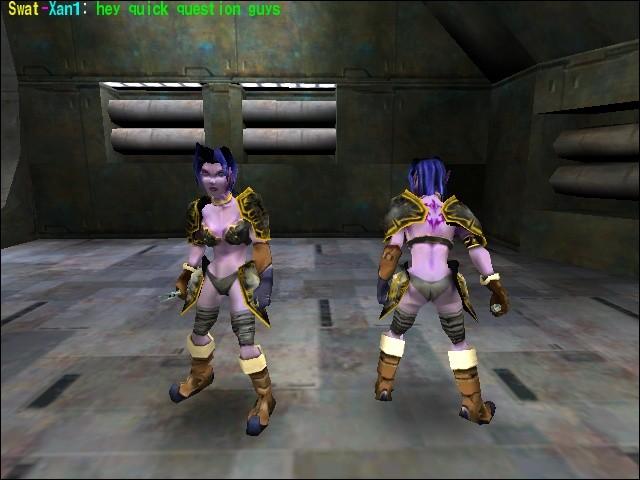 Description: A slight modification of the Night Elf model as released by Flux and the people who helped him. This character is named after the Dark Elf of the same name in the anime "Bastard!!". The armor has been turned black and gray instead of blue and red. Trim on the armor changes colors for team support. I have also changed the tattoo on her back.