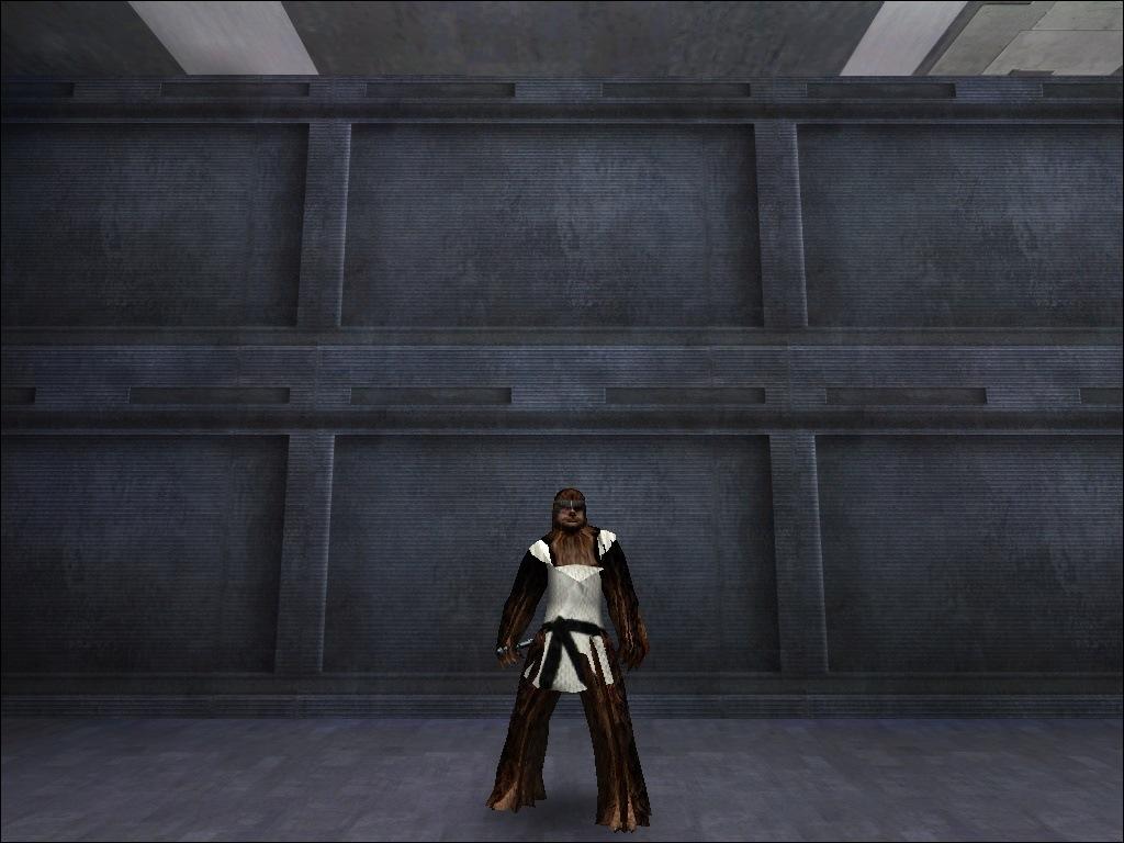 Description: A reskin of the original wookiee, Goober has put a karate suit on him for me (Templar). No sounds have been changed from the original wookiee model. The wookiee now features a white long-sleeved shirt with a white vest on top, white pants, and a black belt.